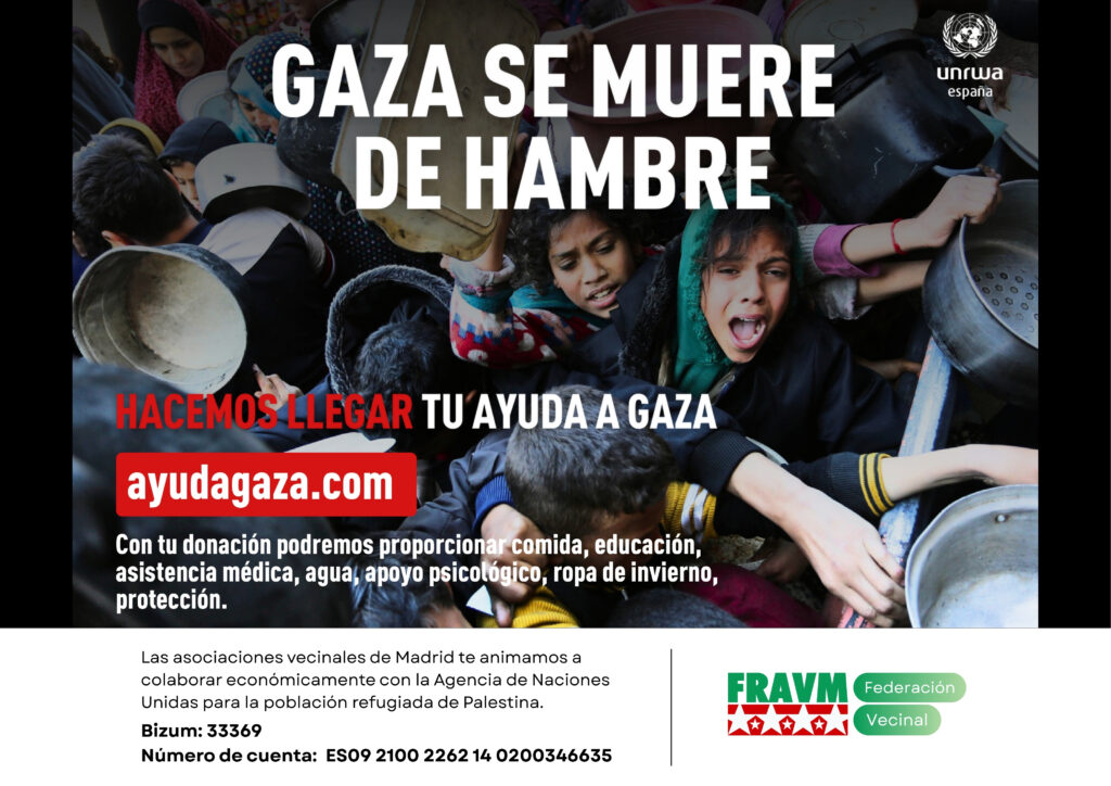 Ante esta emergencia, la Asociación Vecinal Amistad de Canillejas apoya la campaña solidaria organizada por la FRAVM, Federación Regional de Asociaciones Vecinales de Madrid, en colaboración con UNRWA, Agencia de Naciones Unidas para los Refugiados de Palestina.