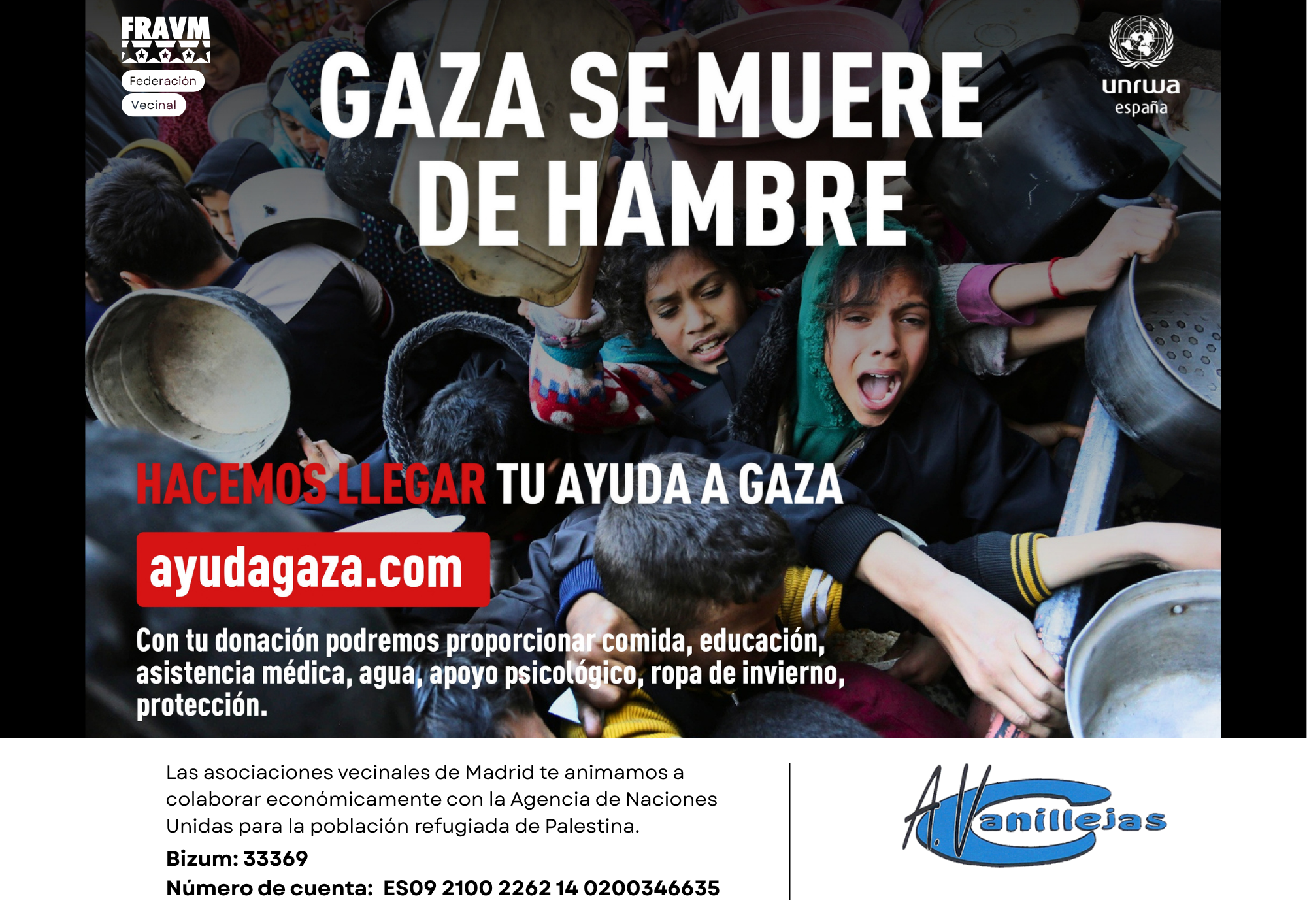 Ante esta emergencia, la Asociación Vecinal Amistad de Canillejas apoya la campaña solidaria organizada por la FRAVM, Federación Regional de Asociaciones Vecinales de Madrid, en colaboración con UNRWA, Agencia de Naciones Unidas para los Refugiados de Palestina.
